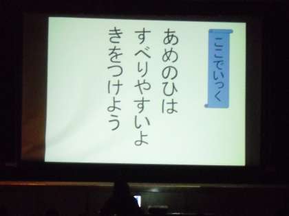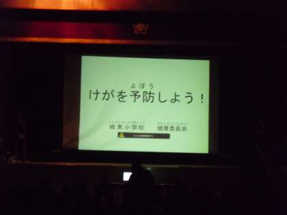 朝の集会で健康委員会が「けがのよぼう」についてのスライドをつかって発表をしました。