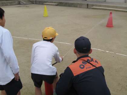 避難後には消防署の方にお話をしていただき、水消火器の使い方を体験しました。