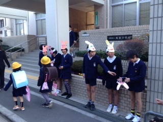 児童会の呼びかけで「あいさつ週間」が始まります。「おはぴょん」登場です。