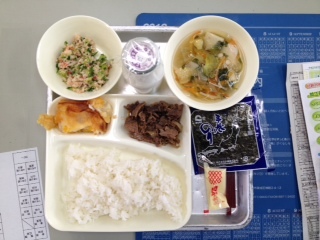 手巻きごはん(牛肉のピリ辛、かにサラダ)すまし汁、ミルククラフティでした。みんなおいしくいただきました。