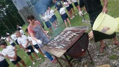 川の水の冷たさに子どもたちは驚いたようです。うまく魚をつかんでおいしくいただきました!!