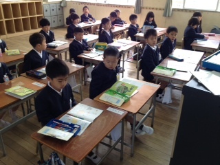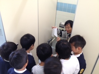 教室では、自由帳に絵をかきました。トイレの使い方も実演入りで説明しました。特に、和式トイレの使い方の指導はむずかしいので、おうちでも教えてください。