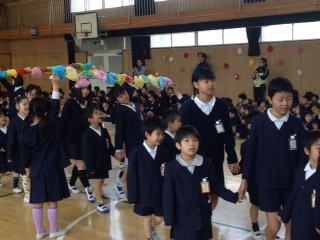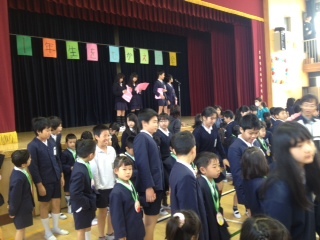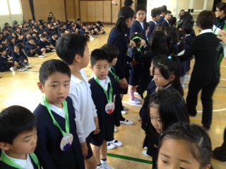 1年生を迎える会がありました。プレゼントのメダルをもらい、一緒にゲームをたのしみました。