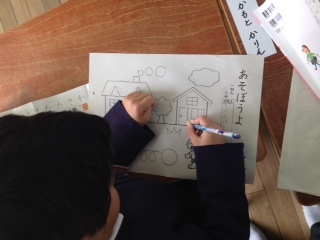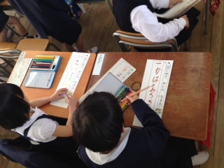 一年生が「えんぴつ」「色えんぴつ」「クレパス」をつかって、自分の名前を書いたり、点線をなぞったりしました。