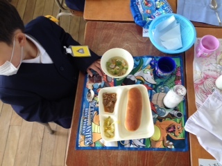 今日のメニューは、豚肉のデミグラスソース、レタスのスープ、サワーソテー、いちごジャムでした。