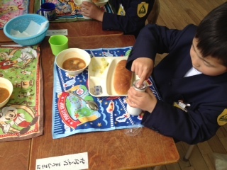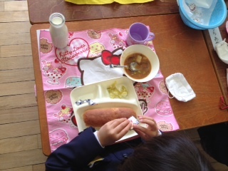 今日の給食は、ビーフシチュー・キャベツのピクルス・固形チーズでした。ちょっと苦手な子も挑戦していました。牛乳のキャップをとるのは大変です。