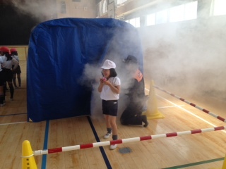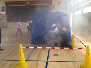 3年生と6年生が煙中体験をしました。テントの中に煙を入れて煙の中に入ります。前が見えない怖さを体験しました。