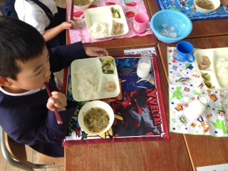 今日のメニューは、鶏肉のからあげ、中華スープ(ワンタンの皮)、キャベツと三度豆の甘酢あえでした。