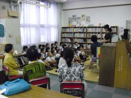 毎週水曜日に、地域のボランティアのみなさんが、学校図書館で子どもたちに、本の読み聞かせや紙芝居をしていただいています。本の整理や修理もしていただいています。