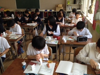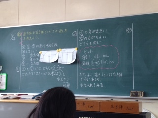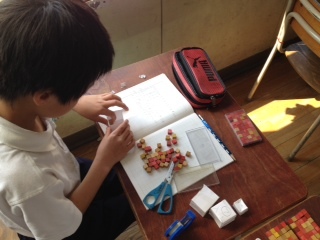 もののかさについて調べていました。紙で作った立方体や直方体に、一辺1センチメートルの小さなさいころを詰めていきます。