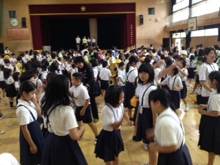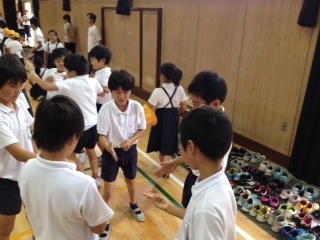 今日の集会活動は「変身ジャンケン」でした。はじめは「かに」でジャンケンに勝ったら「ゴリラ」に、次に勝ったら「フナッシー」になります。集会のときは、自分のくつをシートに並べておきます。みんなきちんと置くことができています。