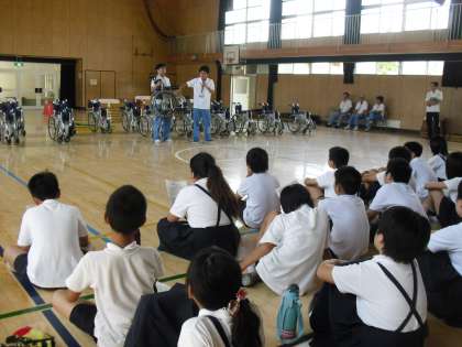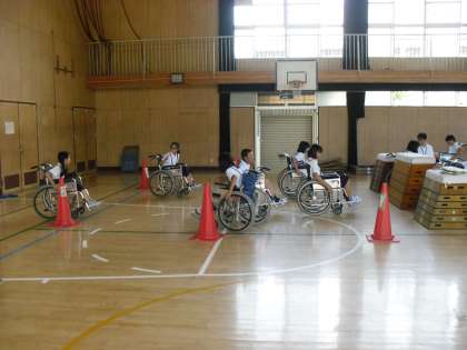 大阪市立リハビリテーションセンターから車いすをもってきてもらい、車いすの体験をしながら学習しました。