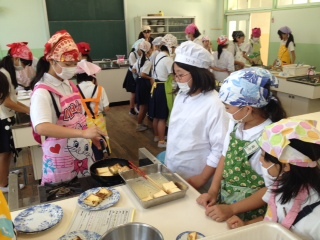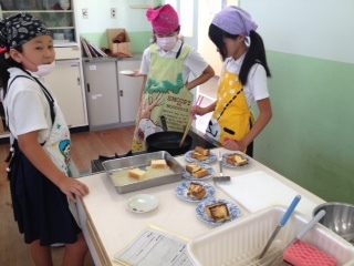 クッキングクラブでフレンチトーストをつくりました。4年生から6年生までのグループを作って協力して活動をしています。