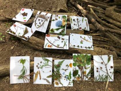ネイチャーゲームで集めた葉っぱや枝ですてきな作品が完成しました。