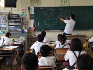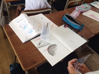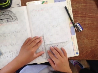 4年生の算数。三角定規を使って、平行四辺形を書いています。いろいろな方法があるので、自分の得意が見つかればいいですね。