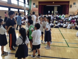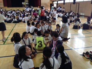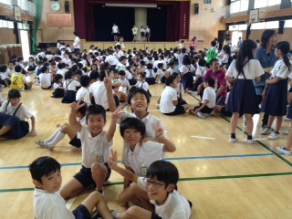 朝から全校児童が体育館に集まって集会活動をしました。今日は、「猛獣狩りへ行こうよ」ゲームでした。司会が「シロナガスクジラ」と言ったら、8人の友達を見つけて座ります。