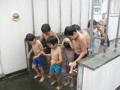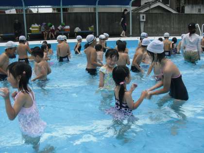 城東幼稚園の年長さんと5年生がいっしょにプールにはいりました。