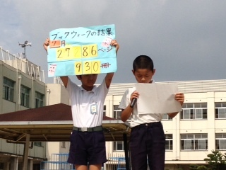 全校朝会の校長先生のお話で「おおさか子ども元気アップ新聞」に6年生の本校児童が紹介されていました。「こつこつ休まず練習を続ける子」というコメントがつけられていました。図書委員会から、ブックウオークの発表がありました。