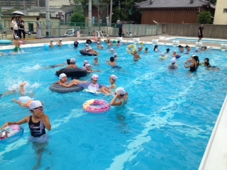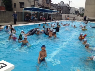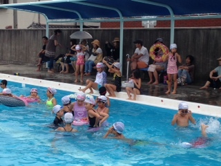 朝から天気が心配でしたが、予定通りふれあいプールを実施することができました。たくさんの子どもたちと保護者のみなさんで楽しく遊ぶことができました。