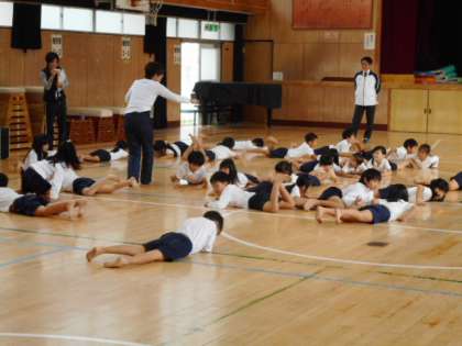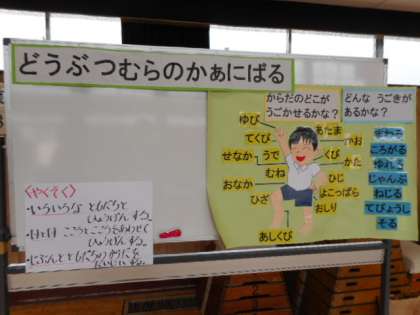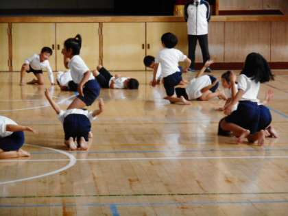 からだをつかって ぴょんぴょん・くにゃくにゃ かわったうごきをする動物になって動きました。一人一人が工夫をして動きをつくっていました。