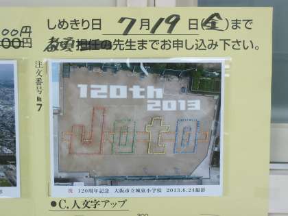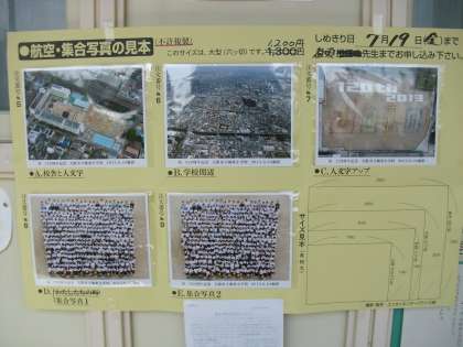 航空写真と集合写真ができたので、その見本と申し込み書が送られてきました。120周年事業として、全校児童と関係者の方にはクリアファイルにしたものを配る予定です。写真をご希望の方は、お知らせください。ちなみに見本の大きさ(六つ切り)で1200円です。