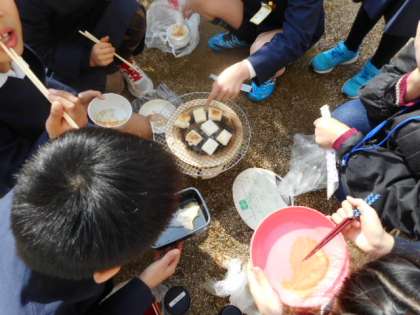 はぐくみ体験学習として「餅焼き体験」をしました。七輪を使って餅を焼きました。焼いたお餅を砂糖醤油につけておいしくいただきました。