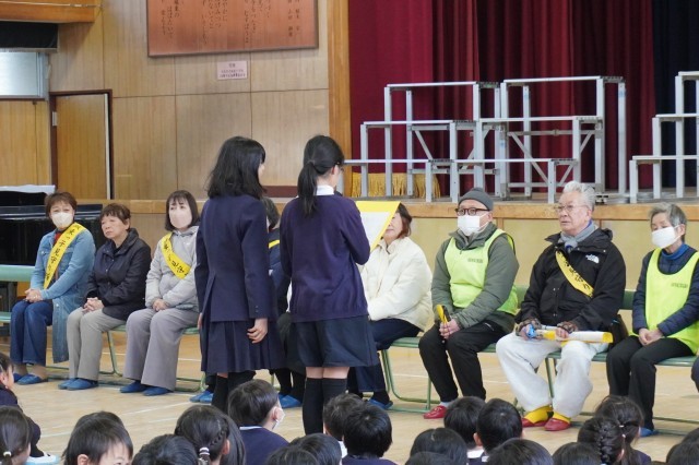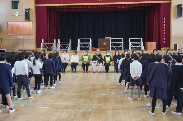 本日、日ごろから子どもたちの安全を見守ってくださる「城東っ子見守り隊」の皆様と、豊かな心を育む本の読み聞かせをしてくださる「おはなしクレヨン」の皆様をお招きし、感謝の集会を開きました。