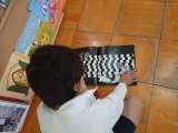 お昼休み1 『へんてこサーカス』という絵本を見て、目の錯覚に首をかしげています。