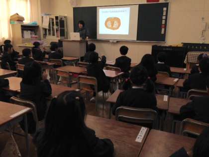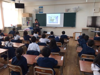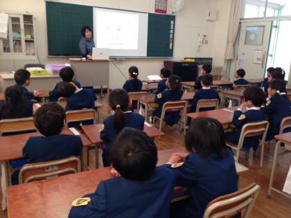 栄養教諭の先生に来ていただいて、給食の指導をしていただきました。クイズや質問にこたえながら、子どもたちは楽しそうに話を聞いていました。