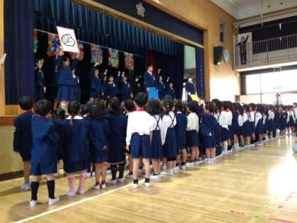 児童会のお兄さんやお姉さんからの「お祝いの言葉」の後、みんなで「ジャンボじゃんけん」をして楽しみました。これからもみんなで仲よく、学校生活を送ってほしいものです。