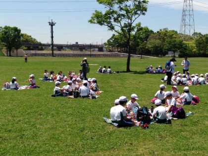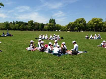 思う存分遊んだ後は、「芝生広場」に移動して、待ちに待ったお弁当の時間です。みんな仲よく、おいしそうに食べていました。食事の後は…?