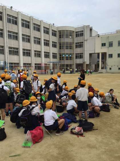 学校到着。揃ったら帰校式です。