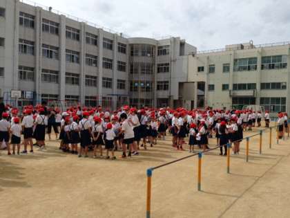 先週の金曜日は残念ながら雨のため、児童朝会は中止になってしまいました。幸い今日は天候に恵まれ、キッズファミリーで「ゴロゴロ ドン!」をして遊ぶことができました。高学年がうまく遊んでくれるので、低学年の子ども達は、とても楽しかったようです。