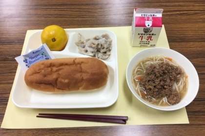 今日のメニューは「タンタンめん、れんこんのオイスターソース焼き、みかん、コッペパン、ブルーベリージャム、牛乳」でした。