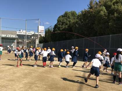 20分休憩と昼休みに、キッズファミリーのみんなでなわ跳びをして遊びます。6年生がなわを回してくれるので、低学年の子ども達も引っかからずに跳ぶことができます。これを機会に、積極的に外で遊んでほしいと願っています。