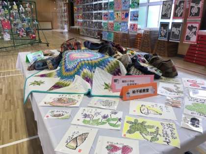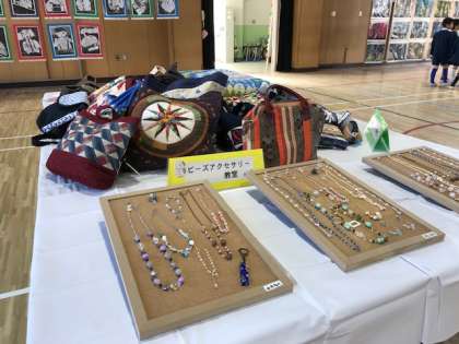 講堂では、生涯学習ルームの「パッチワーク教室」と「ビーズアクセサリー教室」、「絵手紙教室」からも参加していただき、作品展が開かれました。