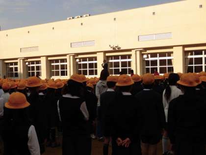 運動場の整備が終わり、新しい並び方での朝会です。