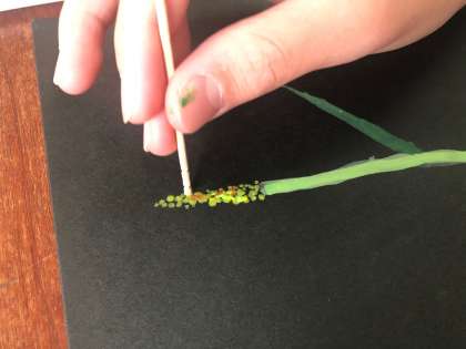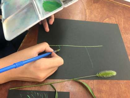 学習園から採ってきたエノコロ草をよく見て、絵の具で黒い画用紙に直接描きました。 線を大切にしながら、色をよく見て重ねていました。みんな、集中して取り組んでいました。