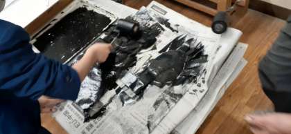 自分の作品にローラーでインクをつけ、バレンでこすり、刷りあがった作品を見て、とても満足そうな笑顔でした。