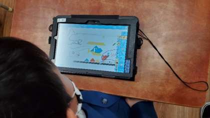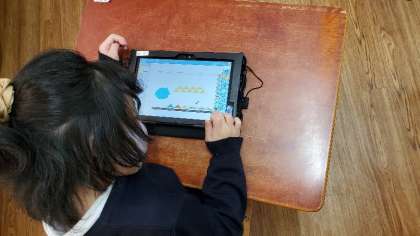 ICT支援員さんから、タブレットの使い方を教わりました。初めて使うタブレットに、子どもたちはとても喜んでいました。この日は、タブレット教材の「ノート」や「いろいた」を使って、お絵かきや算数で学習している「かたちづくり」にチャレンジしました。最初は使い方に戸惑う様子もありましたが、流石は1年生。すぐに慣れて、使いこなすことができていました。