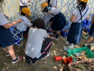 2年生は、ミニトマトの苗植えをしました。移植ごてを使って、植木鉢に一人一つずつ苗を植えました。今年は、工事の関係で校舎南側の学習園のあたりで育てます。これからお世話を頑張ってくれることと思います。たくさん実がなるといいですね!