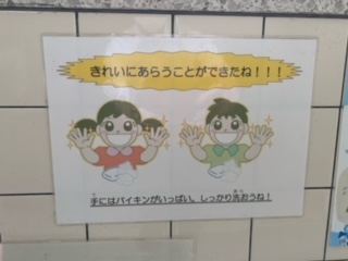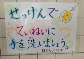 先生方の日々の指導や声掛けはもちろんのこと、子どもたちの手洗いが上手になるしかけが校内には色々とあります。手洗い場にある様々な掲示がその一つです。子どもたちはその掲示をよく見ながら手洗いをしています。