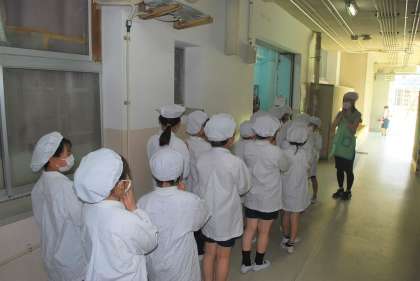 給食当番が給食室前で整列し、元気よく「いただきます。」と言った後、調理員さんから御飯などを渡してもらいます。今日も元気な声が響きます。