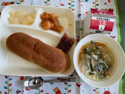★コッペパン・いちごジャム ★牛乳 ★えびのチリソース ★中華スープ ★和なし(カット缶)