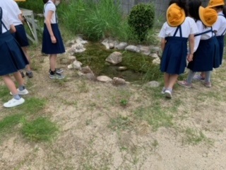 本校の南館校舎西側には、ビオトープがあります。休み時間になると、時折子どもたちが訪れ、昆虫探しをしています。今日は、「ショウリョウバッタ、捕まえた〜」と嬉しそうに報告に来てくれました。「イトトンボおる〜。」「チョウや〜。」と、色々な昆虫を発見しては、盛り上がっていました。最後には、シオカラトンボやアゲハチョウもやってきました。