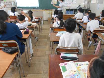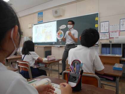 4年生の外国語活動の様子です。3〜6年生は、C−NET(Osaka City Native English Teacher・大阪市英語指導員)が来て、担任の先生と一緒に授業を進めています。5・6年生は週1回、3・4年生は2週に1回のペースでC−NETが授業に入ります。ネイティブの発声・発音からも、英語の力をつけていってほしいです。