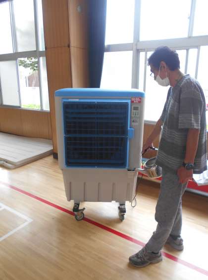 体育館には、昨年度より大型冷風機を設置しております。気化冷却により冷風を送る機械です。体育館には、3台あります。写真は、水を補給しているところです。引き続き、熱中症には十分気をつけながら指導を進めていきます。