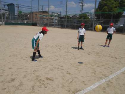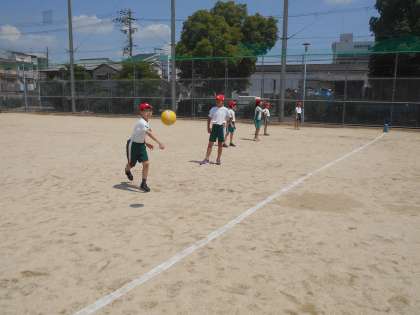 プレルボールは、高さ約4cmほどのロープなどで仕切られたコートを、2チームに別れ、互いにボールをバウンドさせて打ち合うゲームです。とんできた球(ドッジボールなどの大きめのボール)を自分のコートでワンバウンドする前か後に相手コートに返します。簡単に言うとバレーボールとテニスを混ぜ合わせたような競技です。今日は、対戦までのチーム内練習。回してもらったパスをアタックのように打ちつける練習をしました。最初は、難しそうにしていましたが、練習を重ねるうちに少しずつうまく当たるようになってきていました。ボールがつながってくると、楽しくなります。チームワークでがんばってくださいね。