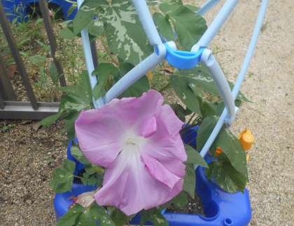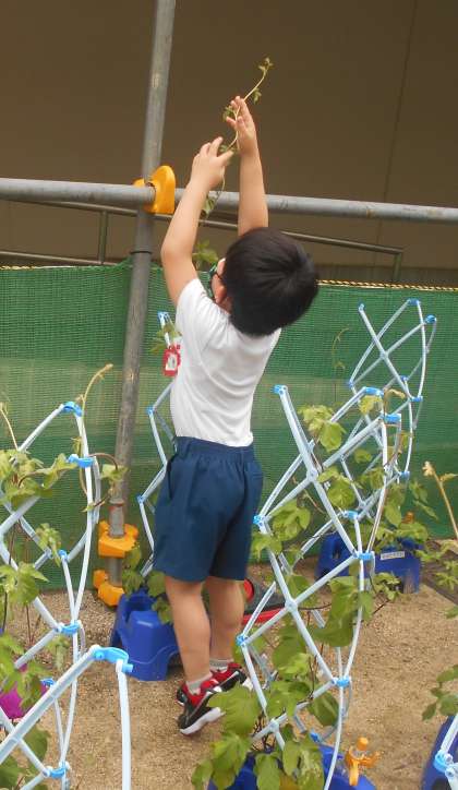 1年生のアサガオが、綺麗な花を咲かせています。土日をはさみましたので、月曜日になって変化が大きかったようで、「葉っぱが、40枚から52枚なってたー!」とか、「つるが、ぼくの身長より伸びてたー!」「○○さんの花、めちゃでかいー!」など、色んな感想を聞かせてくれました。まだまだ、新しいつぼみができ始めています。引き続きお世話をがんばってくださいね。
