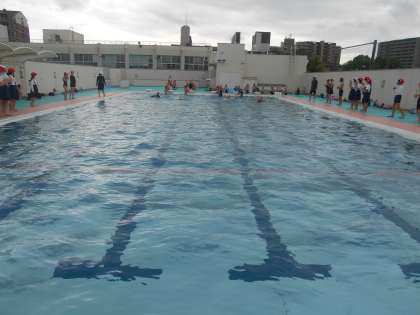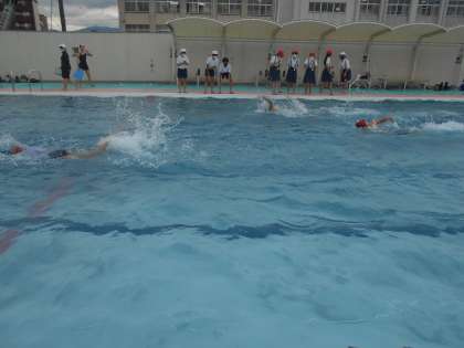 朝からあいにくの天気でしたが、午後から天候が回復し6年生はプール水泳を行うことができました。今日は、クラス対抗水泳大会がありました。メドレーリレー形式で、前歩き→後ろ歩き→カニ歩き→ビート板でバタ足→クロール→平泳ぎ・・・と25mごとで次の泳者に変わります。見学の人も一緒になって、「みんなで盛り上げよう」「楽しもう」とする雰囲気がとても良かったです。